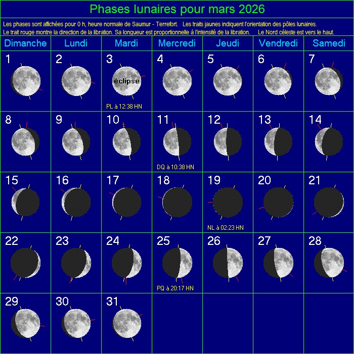 Voici une page générée par le logiciel COELIX, nous donnant pour mois de mars 2026 les phases de la Lune ainsi que l’orientation de ses pôles et la libration en direction et intensité.